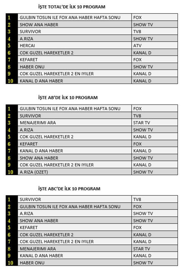 Total reyting kategorisinde dün en çok izlenen program Fox TV'de Gülbin Tosun'un sunumuyla ekrana gelen 'Fox Ana Haber Hafta Sonu' oldu. Listenin ikinci sırasında 'Show Ana Haber' yer alırken, üçüncü sırada 'Survivor', dördüncü sırada 'Hercai' yedinci sırada ise 'Kefaret' dizisi yer aldı. 'Menajerimi Ara' ve 'Tövbeler Olsun' dizileri ilk 10'da yer alamadı.