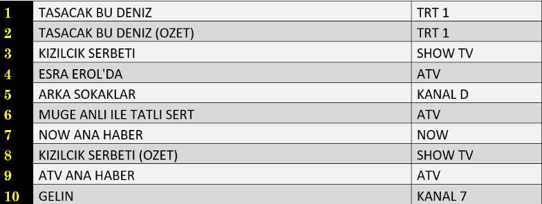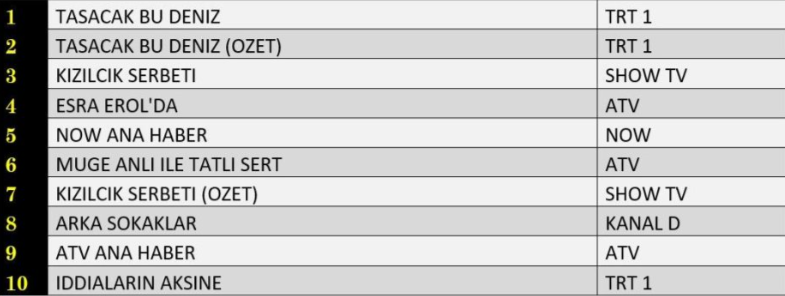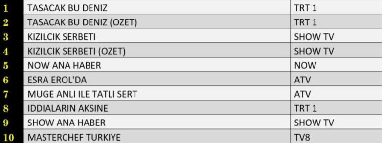 ABC1 kategorisinde 26 Aralık akşamının galibi yine değişmedi. “Taşacak Bu Deniz” dizisi, sürükleyici hikâyesi, güçlü oyunculuk performansları ve her bölüm artan temposuyla izleyicinin ilgisini üst seviyede tutarak birinci sıradaki yerini korudu. Dizinin hemen ardından ekrana gelen özet bölümü, bölümü kaçıran ya da gelişmeleri yeniden takip etmek isteyen seyircilerin tercihi olarak ikinci sıraya yerleşti. Gecenin üçüncüsü ise geniş bir izleyici kitlesine hitap eden dizi “Kızılcık Şerbeti” oldu. Sevilen dizi, istikrarlı izlenme oranlarıyla ABC1 grubunda da ilk üçteki yerini sağlamlaştırdı.