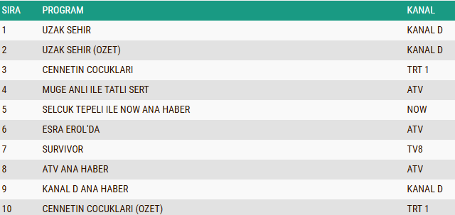 ABC1 izleyici grubunda günün reyting sonuçlarına göre, iki sezondur ekranlarda izleyiciyle buluşan ve istikrarlı başarısını sürdüren başarılı dizi “Uzak Şehir” listenin ilk sırasında yer alarak zirvedeki konumunu korudu. Dizinin özet bölümü “Uzak Şehir (Özet)” yüksek izlenme oranıyla ikinci sıraya yerleşirken, duygusal hikâyesi ve etkileyici anlatımıyla dikkatleri üzerine çeken dizi “Cennetin Çocukları” ise ABC kategorisinde üçüncü sırada kendine yer buldu.