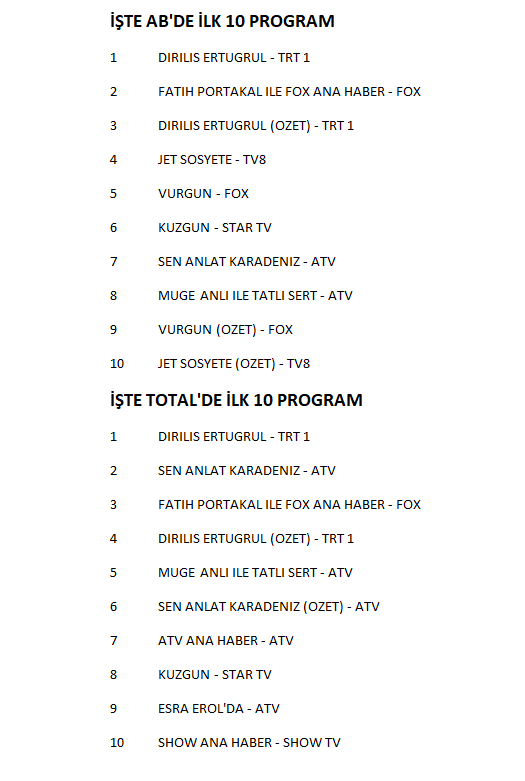 27 ŞUBAT ÇARŞAMBA 2019 REYTİNG SONUÇLARI
