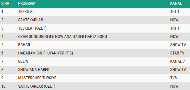 28 Aralık 2025 Pazar gününe ait reyting verileri netleşti ve Total kategorisinde izleyicinin tercihi açıkça ortaya çıktı. Gecenin en çok izlenen yapımı “Teşkilat” olurken, güçlü hikâyesi ve temposu ile zirvedeki yerini korudu. Onu, merak uyandıran konusu ve artan izleyici ilgisiyle “Sahtekarlar” dizisi takip ederek ikinci sıraya yerleşti. Listenin üçüncü basamağında ise “Teşkilat”ın özet bölümü yer aldı ve dizinin ana bölümle birlikte yüksek izlenme başarısını sürdürdüğünü gösterdi.