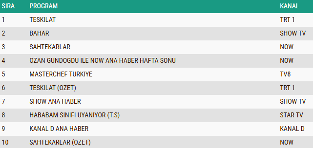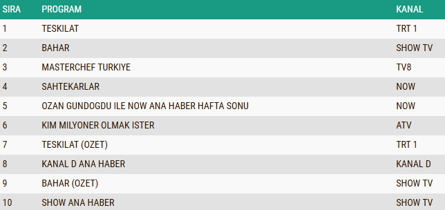 AB kategorisinde 28 Aralık 2025 Pazar akşamının reyting tablosunda zirvenin sahibi yine “Teşkilat” dizisi oldu. Dizi, özellikle AB izleyicisinden gördüğü yüksek ilgiyle günün en çok izlenen yapımı olarak öne çıktı. İkinci sırada, hikâyesindeki duygusal yoğunluk ve güçlü oyuncu performanslarıyla dikkat çeken “Bahar” final bölümü yer aldı. Gecenin üçüncü sırasında ise rekabetin ve heyecanın eksik olmadığı “MasterChef Türkiye” yemek yarışması bulunarak, farklı türlerdeki yapımların AB grubunda güçlü bir izlenme yarışı sergilediği görüldü.