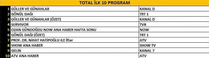 28 Şubat 2026 Cumartesi gününün reyting sonuçları açıklandı ve Total grubunda dikkatleri üzerine çeken bir tablo ortaya çıktı. Akşamın en çok izlenen yapımı Güller ve Günahlar dizisi oldu ve sevilen dizi günü birinci sırada tamamladı. Yayınlanan bölümüyle izleyicinin ilgisini çeken yapım, güçlü hikâyesi sayesinde zirveye yerleşti. Uzun yıllardır izleyicilerin vazgeçilmezleri arasında yer alan Gönül Dağı dizisi ise ikinci sırada kendine yer buldu ve istikrarlı performansını devam ettirdi. Üçüncü sırada ise “Güller ve Günahlar” dizisinin özet bölümü yer aldı.