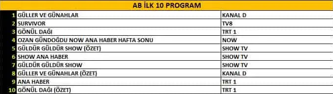 AB izleyici grubunda akşamın zirvesinde Güller ve Günahlar yer aldı ve birinci sırayı kimseye bırakmadı. Dizinin yayınlanan bölümü bu kategoride en çok izlenen yapım oldu. İkinci sırada Survivor 2026 yer aldı ve yarışma programı güçlü performansıyla dikkatleri üzerine çekti. Üçüncü sırada ise Gönül Dağı dizisi bulunarak istikrarlı izlenme oranını devam ettirdi. AB grubunda dizi ve yarışma programları arasında yoğun bir rekabet yaşandı.