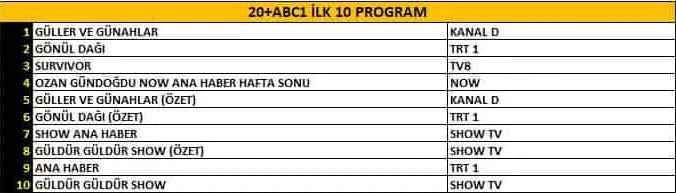 ABC1 izleyici grubunda akşamın en çok izlenen yapımı Güller ve Günahlar dizisi oldu ve birinci sıraya yerleşti. İlgi ile izlenen dizi, bu kategoride de güçlü performansını devam ettirdi. İkinci sırada Gönül Dağı dizisi yer aldı ve sadık izleyici kitlesiyle üst sıralardaki yerini korudu. Üçüncü sırada ise Survivor 2026 yarışma programı yer alarak akşamın en çok izlenen yapımları arasında yer aldı. ABC1 grubunda diziler ile yarışma programı arasında dikkatleri üzerine çeken bir rekabet yaşandı.