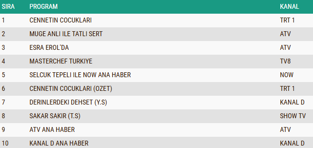 29 Aralık 2025 Pazartesi gününün AB reyting grubunda da dikkat çekici bir sıralama ortaya çıktı. Akşam kuşağında yayınlanan “Cennetin Çocukları” dizisi, bu kategoride de en çok izlenen yapım olarak ilk sıraya yerleşti ve başarısını sürdürdü. Yarışma formatıyla geniş bir izleyici kitlesine ulaşan “MasterChef Türkiye”, istikrarlı performansıyla ikinci sırada kendine yer buldu. Uzun yıllardır gündüz kuşağının vazgeçilmezleri arasında yer alan “Müge Anlı ile Tatlı Sert” programı ise güçlü izlenme oranlarıyla üçüncü sırayı aldı.