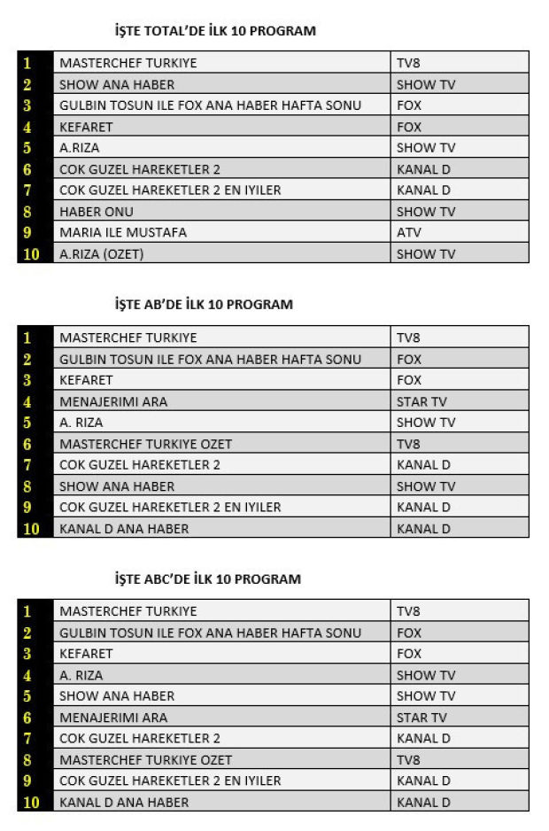 ABC kategorisinde ise 'Kefaret' üçüncü, 'Arıza' dördüncü, 'Menajerimi Ara' altıncı, 'Çok Güzel Hareketler 2' yedinci sırada yer alırken 'Tövbeler Olsun' ve Maria ile Mustafa dizileri ilk 10'da yer alamadı.