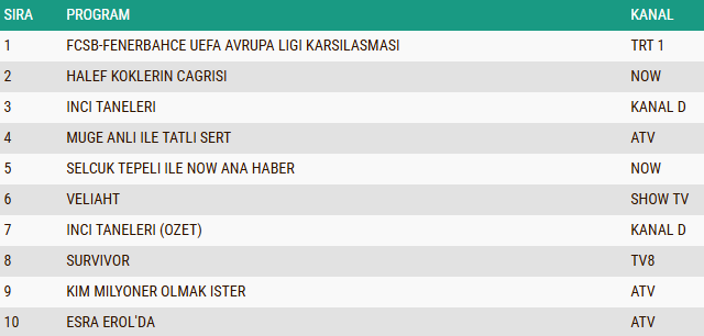 AB izleyici grubunda da 29 Ocak 2026 Perşembe akşamının en çok izlenen yapımı değişmedi ve UEFA Avrupa Ligi kapsamında oynanan FCSB – Fenerbahçe karşılaşması, futbolseverlerin yoğun ilgisiyle listenin zirvesine yerleşti. Gecenin ikinci sırasında, dramatik yapısı ve sürükleyici kurgusuyla dikkatleri üzerine çeken “Halef Köklerin Çağrısı” isimli dizi yer alarak güçlü bir izlenme performansı sergilerken, duygu yüklü sahneleriyle ön plana çıkan “İnci Taneleri” dizisi ise yeni sezon ilk bölümüyle AB grubunda üçüncü sırayı alarak günün en çok izlenen yapımları arasında kendine sağlam bir yer edindi.