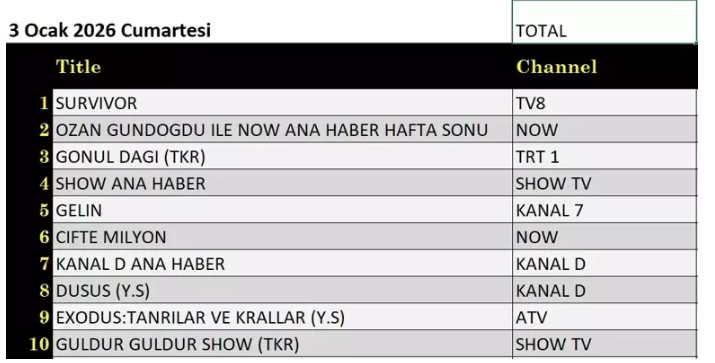 3 Ocak 2026 Cumartesi gününe ait reyting verileri açıklanırken, Total kategorisinde izleyicinin tercihi net bir şekilde ortaya çıktı. Gecenin zirvesinde, temposu ve rekabeti yüksek bölümüyle geniş bir izleyici kitlesini ekran başına toplayan “Survivor” yarışma programı yer aldı ve günün en çok izlenen yapımı oldu. İkinci sırada, hafta sonu gündemini ve öne çıkan gelişmeleri aktaran “Ozan Gündoğdu ile NOW Ana Haber Hafta Sonu” bulunarak haber bültenlerinin güçlü izlenme potansiyelini bir kez daha gösterdi. Listenin üçüncü basamağında ise tekrar bölümüyle ekrana gelmesine rağmen sadık izleyicisini koruyan “Gönül Dağı” dizisi yer aldı.