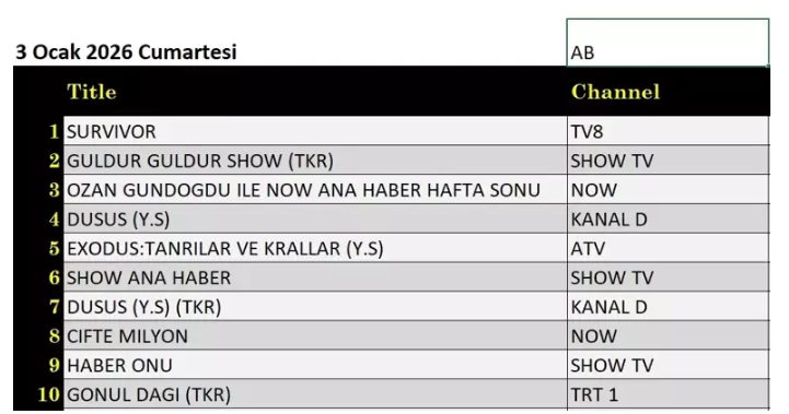 3 Ocak 2026 Cumartesi gününe ait reyting sonuçlarının netleşmesiyle birlikte AB kategorisinde izleyici tercihleri de ortaya çıktı. Günün en çok izlenen yapımı, rekabet dozu yüksek bölümüyle ekran başına geniş bir kitleyi toplayan “Survivor” yarışma programı oldu ve zirvenin sahibi olmayı başardı. Onu, tekrar bölümüyle yayınlanmasına rağmen güçlü izlenme oranları yakalayan ve her kuşakta sadık izleyicisini koruyan “Güldür Güldür Show” programı takip ederek ikinci sıraya yerleşti. Günün üçüncü sırasında ise hafta sonu gündemini aktaran “Ozan Gündoğdu ile NOW Ana Haber Hafta Sonu” yer aldı.
