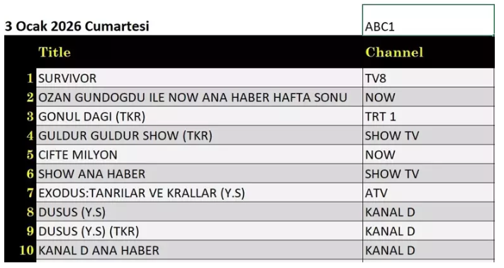 ABC1 kategorisinde de 3 Ocak Cumartesi akşamının lideri değişmedi ve “Survivor” yarışma programı, geniş kitlelere ulaşan temposu yüksek bölümüyle birinciliğe yerleşti. Onu, hafta sonunun öne çıkan başlıklarını ve güncel gelişmeleri izleyiciye aktaran “Ozan Gündoğdu ile NOW Ana Haber Hafta Sonu” takip ederek ikinci sırada yer aldı. Listenin üçüncü basamağında ise tekrar bölümüyle ekrana gelmesine rağmen istikrarlı izleyici kitlesini koruyan “Gönül Dağı (Tekrar)” yer alarak, dizinin farklı yayınlarında bile ilgi görmeye devam ettiğini göstermiş oldu.