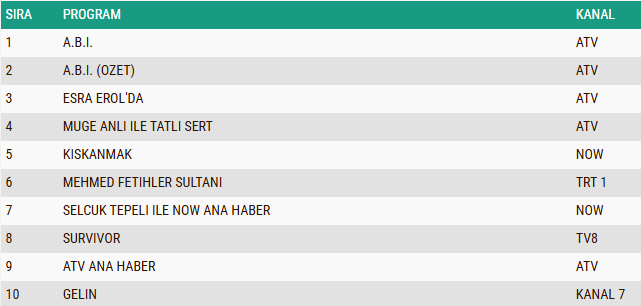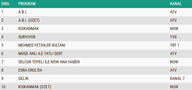AB izleyici grubunda 3 Şubat 2026 Salı gününün reyting tablosu da dikkat çekici sonuçlar ortaya koydu. Prime time kuşağında yayınlanan yeni bölümüyle “A.B.İ.” dizisi, yüksek izlenme oranlarıyla günün en çok izlenen yapımı olarak zirveye yerleşirken, dizinin özet bölümü de izleyiciden gördüğü yoğun ilgi sayesinde ikinci sırada kendine yer buldu. Akşam kuşağında ekranlara gelen ve güçlü hikâyesiyle ön plana çıkan “Kıskanmak” dizisi ise AB grubunda üçüncü sıraya yerleşerek günün en çok tercih edilen yapımları arasında yer aldı.