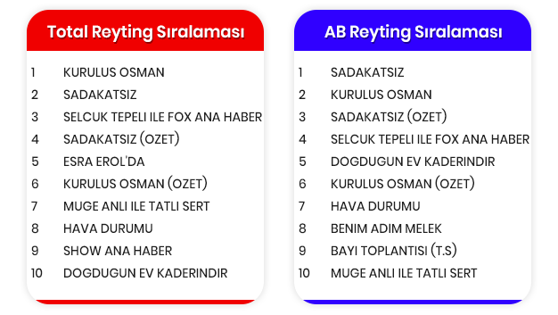 AB'de ise günün birincisi 'Sadakatsiz' olurken, 'Kuruluş Osman' ikinci, 'Doğduğun Ev Kaderindir' beşinci, 'Benim Adım Melek' dizisi ise sekizinci sırada günü tamamladı.