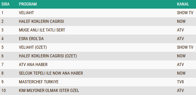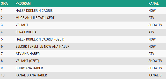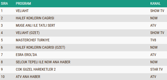 ABC kategorisinde bu hafta ekran rekabeti oldukça yoğun geçti. Haftanın en çok izlenen yapımı, Show TV'nin iddialı dizisi olurken, yapım birinciliği kimseye kaptırmadı. Onu, NOW TV'de yayınlanan ve her bölümü ile izleyiciyi ekran başına kilitleyen popüler dizi takip etti. Gündüz kuşağı programları, izleyiciyi günlük yaşamın içinden hikayelerle buluşturan akıcı sunumları sayesinde listede üst sıralardaki yerini korudu. Ana haber bültenleri ise akşam saatlerinde geniş bir izleyici kitlesine ulaşarak haber kuşağının güçlü etkisini sürdürdü. Ayrıca TV8'in sevilen yemek programı ve Atv'nin dikkat çeken yarışması gibi eğlence odaklı yapımlar, ABC grubunda haftanın öne çıkan içerikleri arasında yer aldı.