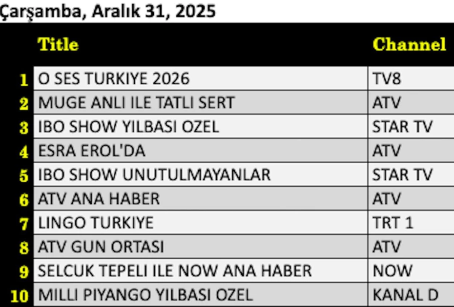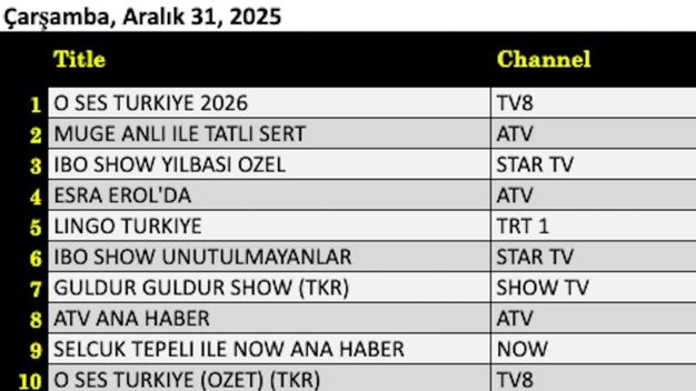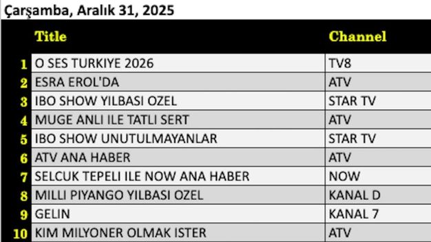 31 Aralık 2025 Çarşamba gününe ait reyting tablosu netleşti. Yılbaşı akşamının en çok izlenen yapımı, renkli performansları ve özel konseptiyle ekrana gelen “O Ses Türkiye Yılbaşı” programı oldu ve Total grubunda zirveye yerleşti. Gündüz kuşağında istikrarlı izleyici kitlesini koruyan “Esra Erol’da” gündüz kuşağı programı, yoğun rekabete rağmen ikinci sırayı alarak güçlü performansını sürdürdü. Yılbaşı gecesine özel bölümüyle ekranlara gelen “İbo Show Yılbaşı Özel” programı ise eğlenceli içeriğiyle dikkatleri üzerine çekerek Total kategorisinde günü üçüncü sırada tamamladı.