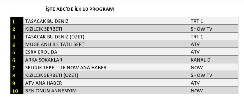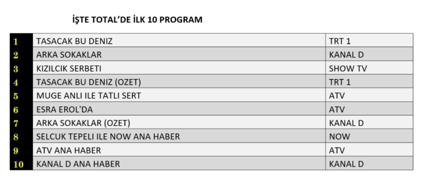 Listenin ikinci sırasında, toplumsal temaları ve çarpıcı diyaloglarıyla dikkatleri üzerine çeken Kızılcık Şerbeti yer aldı. Üçüncü sırada ise Taşacak Bu Deniz'in özet bölümü bulunarak dizinin ne kadar güçlü bir izleyici bağlılığına sahip olduğunu bir kez daha ortaya koydu.