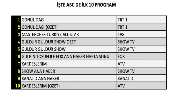 Zirvedeki Gönül Dağı ve Özetini Masterchef Türkiye All Star ve Güldür Güldür Show ve Özeti takip ediyor. Fox Ana Haber, Kardeşlerim, Show Ana Haber, Kanal D Ana Haber ve Kardeşlerim Özeti listelere giren diğer yapımlar oldu.