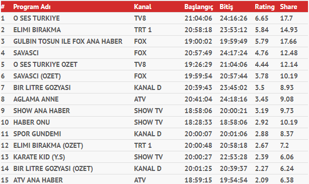 Dün TV8’de O Ses Türkiye, Atv’de Ağlama Anne, Fox TV’de Savaşçı, TRT 1’de Elimi Bırakma, Kanal D’de Bir Litre Gözyaşı, Star TV’de Eyvah Düşüyorum yapımları reyting mücadelesi verdi.