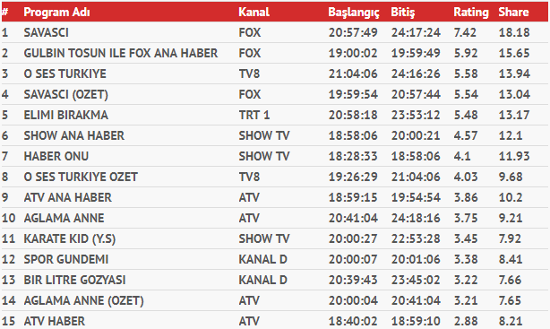 Fox TV ekranlarının başarılı dizisi Savaşçı, 28 Ekim Pazartesi günü, yapım ekibi ve çalışanlar arasında çıkan anlaşmazlıklardan dolayı ekranlara gelmemişti. 1 hafta aradan sonra dün yeni bölümüyle ekranlarda olan dizi TOTAL’de 7,42 izlenme oranı ve 18,18 izlenme payı ile birinci sırada yer alırken, AB’de 4,76 izlenme oranı ve 17,66 izlenme payı ile dördüncü sırada yer aldı.