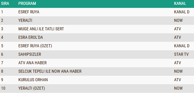 ABC1 izleyici grubunda da tablo değişmedi ve etkileyici hikâyesiyle ön plana çıkan “Eşref Rüya” dizisi günün en çok izlenen yapımı olarak birinciliği kimseye bırakmadı. Yayınlandığı ilk günden itibaren dikkatleri üzerine çeken dizi “Yeraltı”, bu kategoride de güçlü izlenme oranlarıyla ikinci sıraya yerleşti. Gündüz kuşağının vazgeçilmez programlarından “Müge Anlı ile Tatlı Sert” sabah programı ise sadık izleyici kitlesinin desteğiyle ABC1 grubunda üçüncü sırada yer alarak istikrarlı başarısını devam ettirdi.
