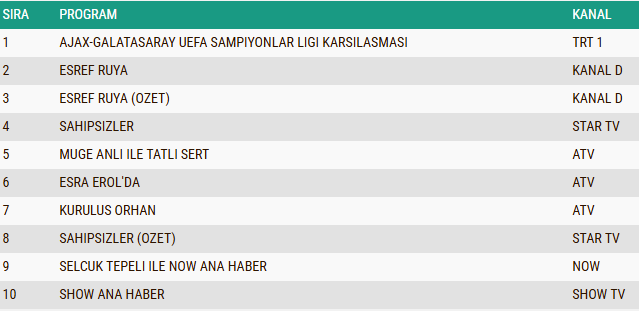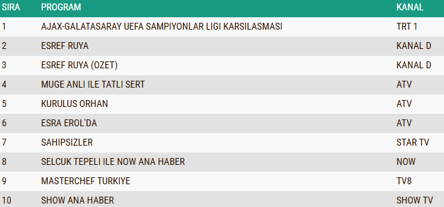 Reyting listesinde ikinci sırayı Kanal D'nin büyük beğeni toplayan dizisi "Eşref Rüya", üçüncü sırayı ise dizinin özet bölümü aldı. Star TV'de ekrana gelen "Sahipsizler"  dizisi dördüncü sırada kendine yer bulurken, Atv'nin sevilen gündüz kuşağı programları "Müge Anlı ile Tatlı Sert" ve "Esra Erol'da" beşinci ve altıncı sıralarda yer alarak güçlü performansını devam ettirdi.