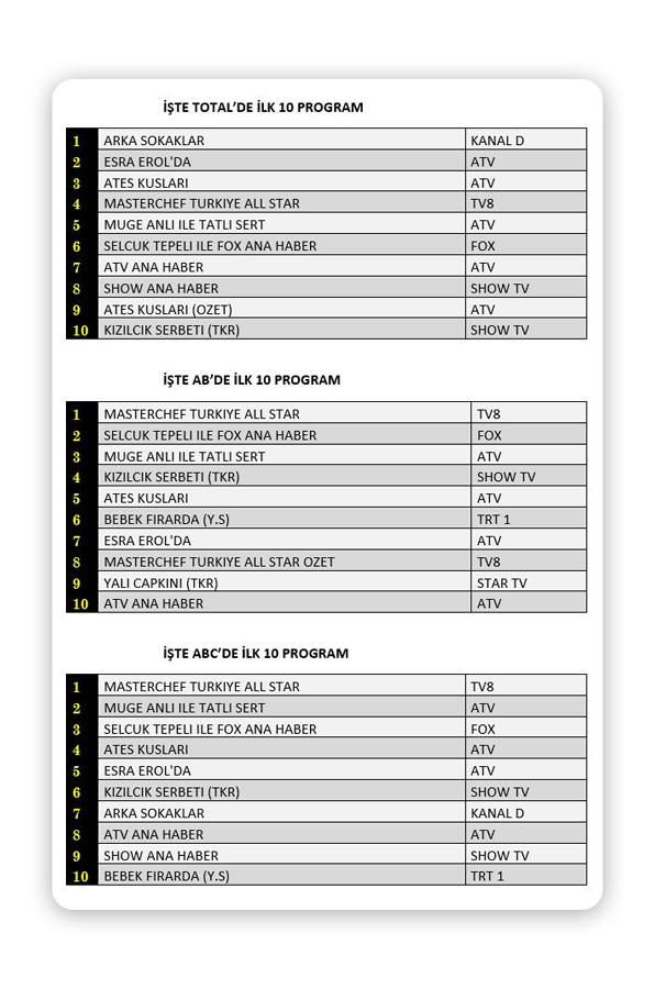 AB izleyicisinin tercihi tv8'de yayınlanan ‘MasterChef Türkiye’den yana oldu. Program günü birinci sırada tamamlarken, ‘Selçuk Tepeli ile Fox Ana Haber’ ikinci, ‘Müge Anlı ile Tatlı Sert’ üçüncü, ‘Kızılcık Şerbeti’ dizisinin özet bölümü dördüncü, ‘Ateş Kuşları’ ise beşinci sırada yer alan yapım oldu.