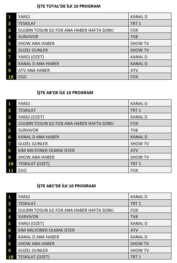 Total’de sıralama bu şekilde oluşurken bir önemli reyting ölçümü olan AB'de ise yargı fırtınası esti. Polisiye gerilim dizisi Yargı hem yeni bölüm hem de özet bölümüyle zirveye damga vurdu. 1.sırada Yargı, 2.sırada yine Teşkilat, 3.sırada Yargı dizisinin özeti yer aldı.