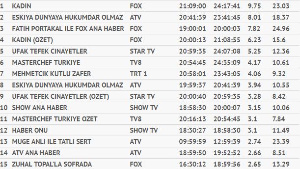 TOTAL'de dün en çok izlenen dizi 12.26 izlenme oranı, 28.38 izlenme payı ile Fox TV ekranlarında yayınlanan Kadın dizisi oldu. Listenin ikinci sıradasında 9,18 izlenme oranı, 20,37 izlenme payı ile Eşkiya Dünyaya Hükümdar Olmaz yer aldı. Kadın dizisinin özet bölümü 3. sırada, Fatih Portakal ile Fox Ana Haber 4. sırada, Eşkiya Dünyaya Hükümdar Olmaz dizisinin özet bölümü 5. sırada yer aldı.