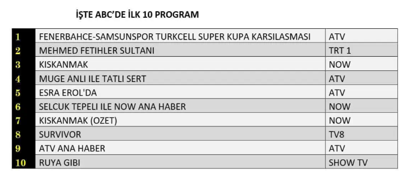 AB izleyici grubunda 06 Ocak 2026 Salı gününün reyting sıralaması da netleşti. Günün zirvesine, geniş bir izleyici kitlesini ekran başına toplayan Fenerbahçe–Samsunspor Türkcell Süper Kupa Karşılaşması yerleşti. Etkileyici hikâyesiyle dikkatleri üzerine çeken “Kıskanmak” dizisi, güçlü performansıyla ikinci sırada kendine yer bulurken, tarihsel anlatımı ve prodüksiyon kalitesiyle ön plana çıkan “Mehmed: Fetihler Sultanı” isimli fenomen dizi ise günü üçüncü sırada tamamladı.