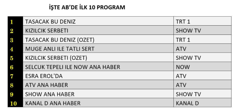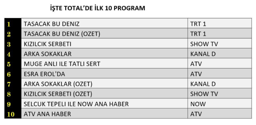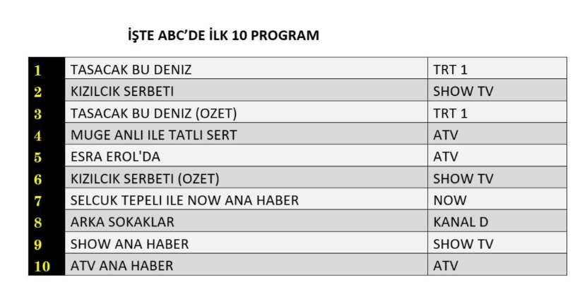 ABC1 kategorisinde rekabetin kazananı yine "Taşacak Bu Deniz" oldu. Dizi, güçlü hikayesi ve etkileyici atmosferi ile birinciliği kimseye bırakmadı. Hemen arkasından, istikrarlı performansını devam ettiren Kızılcık Şerbeti dizisi ikinci sırada yer aldı. TRT 1 ekranlarının başarılı yapımı "Taşacak Bu Deniz (Özet)" ise yüksek izlenme oranını koruyarak gecenin üçüncü sırasında kendine yer buldu.