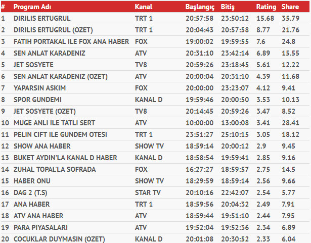 TOTAL'de TRT 1'in en çok izlenen dizisi Diriliş Ertuğrul dün yayınlanan bölümüyle 31,93 share ile zirvede yer aldı. Sen Anlat Karadeniz 25,66 share ile 2. sırada, Diriliş Ertuğrul 21,76 share ile 3. sırada, Fatih Portakal ile Fox Ana Haber 20,4 share ile 4. sırada yer alırken, Sen Anlat Karadeniz (Özet) 5. sırada yer aldı. Günün diğer iddialı dizileri Jet Sosyete ve Çocuklar Duymasın TOTAL reytinglerinde resmen çakıldı. Jet Sosyete 6,1 share ile 15. sırada yer alırken, Çocuklar Duymasın 5,63 share ile 19. sırada yer aldı.