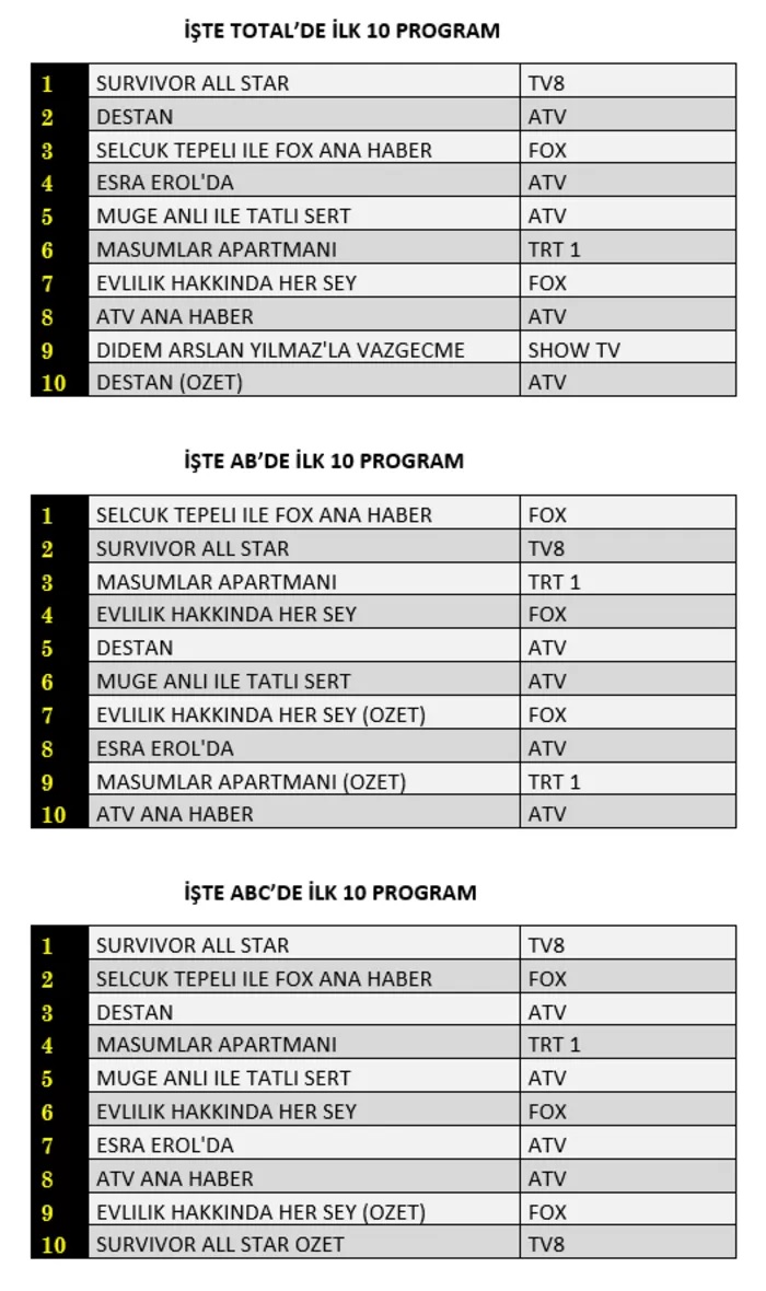 ABC izleyici grubunda günün en çok izlenen yapımı tv8'de yayınlanan "Survivor All Star" oldu. Böylece başarılı program iki listede birinci bir listede ise günü ikinci sırada tamamlamış oldu. "Selçuk Tepeli ile Fox Ana Haber" ikinci, "Destan" üçüncü, "Masumlar Apartmanı" dördüncü, "Müge Anlı ile Tatlı Sert" ise günü beşinci sırada tamamlayan yapımlar oldu.
