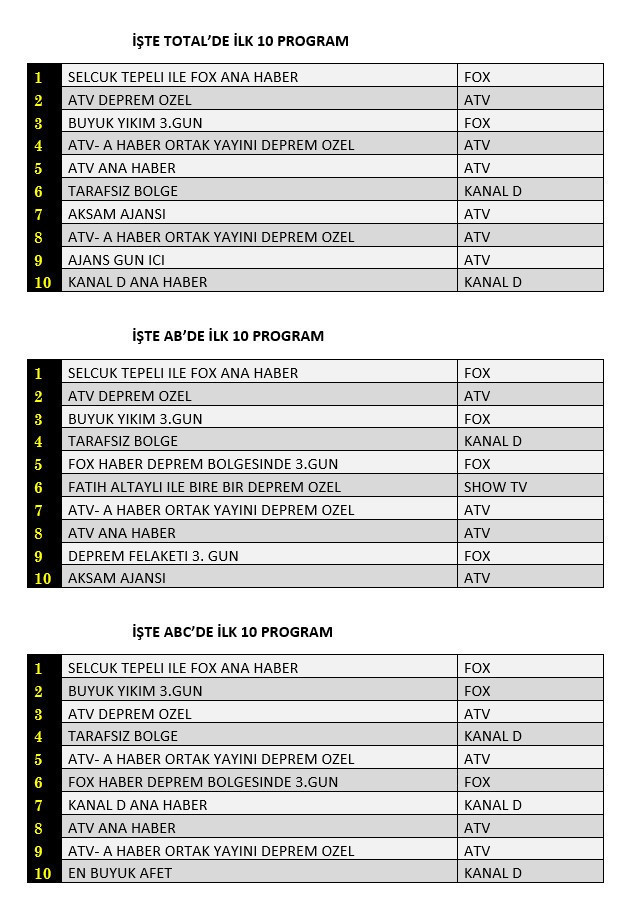 Total'de 1.sırayı “Selçuk Tepeli ile Fox Ana Haber”, 2. sırayı “Atv Deprem Özel”, 3.sırayı ise yine Fox Tv’de ekrana gelen Büyük Yıkım 3. Gün yayını aldı. Bir başka reyting ölçümü olan AB'de ise 1.sırayı “Selçuk Tepeli ile Fox Ana Haber” 2.sırayı “Atv Deprem Özel” 3.sırayı ise “Büyük Yıkım 3. Gün aldı. 20+ABC1 izleyici grubunda ise Selçuk Tepeli ile Fox Ana Haber ilk sırayı alırken Büyük Yıkım 3. Gün ve Atv Deprem Özel ilk üçteki yerini korudu. İşte güne damga vuran reyting listeleri
