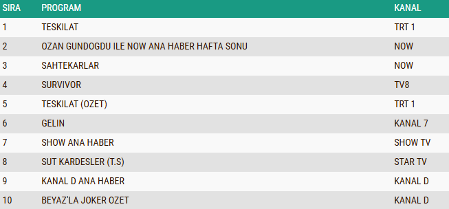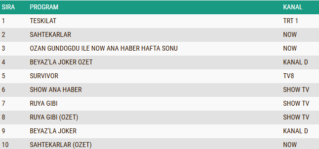 08 Şubat 2026 Pazar günü ABC1 reyting grubunda da aksiyon ve gerilimi yüksek bölümüyle ekran başındakileri etkisi altına alan dizi “Teşkilat”, ABC1 kategorisinde de liderliği kimseye bırakmayarak birinci sıraya yerleşti. Hikâyesindeki sürpriz gelişmeler ve yükselen temposuyla dikkatleri üzerine çeken dizi “Sahtekarlar”, aldığı istikrarlı izlenme oranlarıyla günü ikinci sırada tamamladı. Güncel gelişmeleri detaylı ve güvenilir bir yayınla izleyiciye aktaran “Ozan Gündoğdu ile Now Ana Haber Hafta Sonu” ise ABC1 grubunda üçüncü sırada yer aldı.