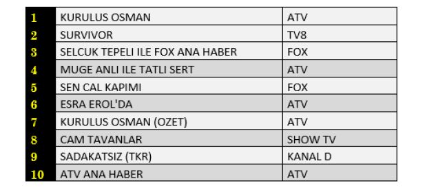Total'de dün en çok izlenen program Atv'de yayınlanan 'Kuruluş Osman' oldu. Listenin ikinci sırasında 'Esra Erol'da', üçüncü sırasında ise 'Müge Anlı ile Tatlı Sert' yer aldı. Böylece Atv kanalı total'de ilk 3'e 2 program ve bir dizisinin sokmayı başardı. Listenin devamında 'Survivor' dördüncü, 'Kuruluş Osman' özet bölümü beşinci sırada yer aldı. Günün diğer prime time dizileri 'Sen Çal Kapımı' yedinci, ilk bölümüyle yayınlanan 'Cam Tavanlar' ise onuncu sırada günü tamamladı.