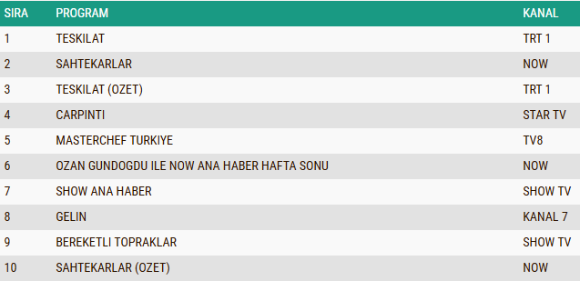 Pazar gecesi televizyon ekranlarında kıyasıya bir izlenme yarışı yaşandı. Aksiyon dolu diziler, duygusal hikayeler ve rekabetin eksik olmadığı yarışma programları arasında zorlu bir mücadele dikkat çekti. TRT 1'in iddialı dizisi zirvedeki istikrarlı performansını sürdürürken, NOW'un yeni yapımı ilk bölümleri ile izleyiciden tam not alarak öne çıktı. Gecenin özet yayınları da yüksek izlenme oranları ile listelerde yer buldu. Öte yandan Star TV, Show TV ve TV8'in popüler yapımları da reyting sıralamasında güçlü bir varlık gösterirken, ana haber bültenleri pazar akşamının en çok takip edilen yayınları arasında yer aldı.