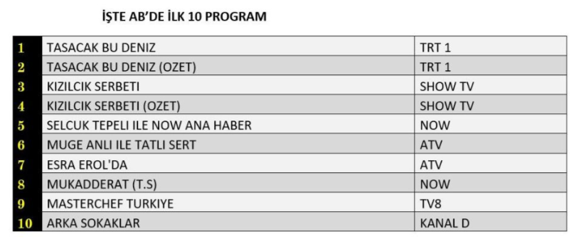 AB izleyici grubunda da tablo değişmedi. “Taşacak Bu Deniz” isimli fenomen dizi, etkileyici bölümüyle reyting listesinin zirvesine adını yazdırarak başarısını bu kategoride de sürdürdü. Dizinin özet bölümü izleyiciden yoğun ilgi görerek ikinci sıraya yerleşirken, Cuma akşamlarının dikkatleri üzerine çeken yapımlarından “Kızılcık Şerbeti” dizisi ise günü üçüncü sırada tamamlamayı başardı.