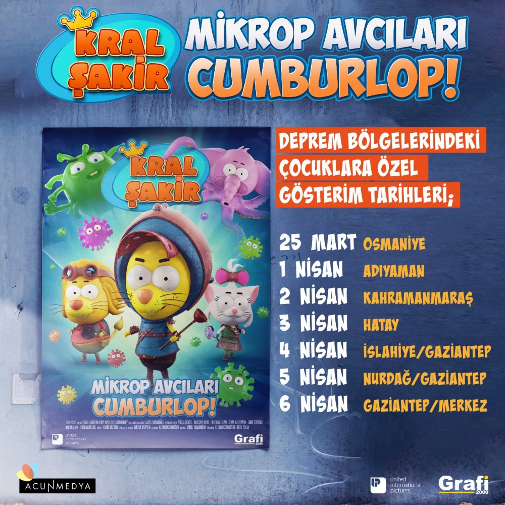 Acun Ilıcalı ve Varol Yaşaroğlu tarafından organize edilen “Kral Şakir Mikrop Avcıları Cumburlop” filminin afet bölgesindeki gösterim tarihleri de belli oldu ve bir liste halinde yayınlandı. işte Deprem Bölgelerindeki Çocuklara Özel Gösterim Tarihleri…