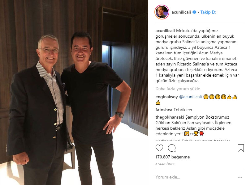 Meksika’da yaptığımız görüşmeler sonucunda, ülkenin en büyük medya grubu Salinas’la anlaşma yapmanın gururu içindeyiz. 3 yıl boyunca Azteca 1 kanalının tüm içeriğini Acun Medya üretecek. Bize güvenen ve kanalını emanet eden sayın Ricardo Salinas’a ve tüm Azteca medya grubuna teşekkür ediyorum. Azteca 1 kanalıyla yeni başarılar elde etmek için var gücümüzle çalışacağız.