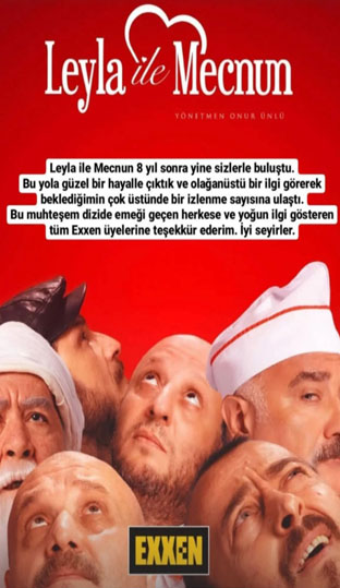 TRT 1 ekranlarında yıllar önce yayınlanan ve seyircinin büyük beğenisini toplayan ve bir fenomene dönüşen ünlü dizi Leyla ile Mecnun uzun bir aradan sonra yeniden seyirciyle buluştu. Geçtiğimiz günlerde ilk bölümüyle Exxen’de yeniden yayınlanmaya başlayan efsane dizi Leyla ile Mecnun büyük bir ilgiye karşılaştı. Seyircinin büyük ilgisiyle karşılan ve yayınlanan ilk bölümü her zaman ki gibi eski bölümlerindeki heyecanı ve tadı aratmadı. 8 yıl aranın ardından uzun bir çalışmanın ardından eski kadrosunu yeniden toplayan çekimlere yeniden başlayan dizi internet yayın platformu Exxen’de yayınlanmaya başlandı. Dizinin ilk bölümünün büyük bir ilgiye karşılaşması Exxen’in sahibi Acun Ilıcalı’yı da şaşırttı. Bu kadar büyük bir ilgi beklemediğini ifade eden Acun Ilıcalı bu durumu bir paylaşımla dile getirdi.