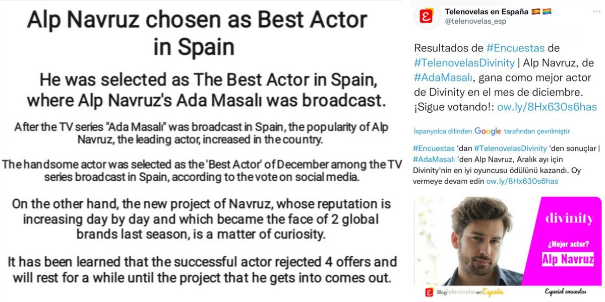 TV100'den Birsen Altuntaş'ın haberine göre; ünlü oyuncu Alp Navruz, İspanya'da yayınlanan diziler içerisinde en iyi erkek oyuncu seçildi. Başarılı oyuncu, İspanya'da yayınlanmaya başlanan ve başrolünde oynadığı Ada Masalı ile en iyi erkek oyuncu ödülüne layık görüldü. Aynı habere göre Alp Navruz'a ayrıca 4 ayrı projeden teklif geldiği ve oyuncunun içine sinen projeyi kabul edeceği belirtildi.
