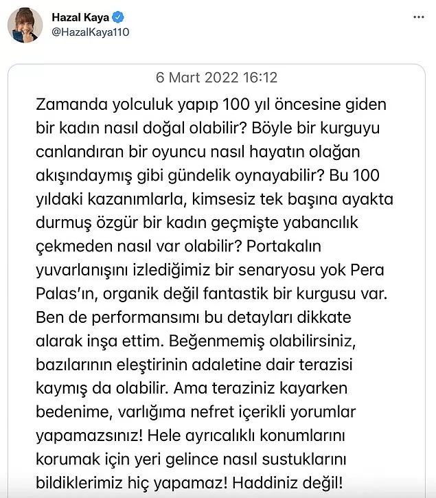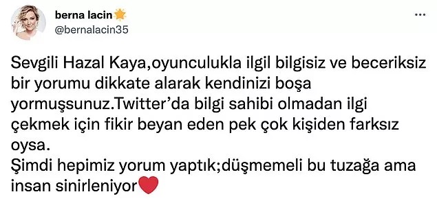 Ünlü oyuncu Hazal Kaya’dan ise cevap gecikmedi. Hem İnstagram hem Twitter hesaplarından ders niteliğinde cevap verdi ‘’Beğenmemiş olabilirsiniz, bazılarının eleştirilerinin adaletine dair terazisi kaymış da olabilir. Ama terazi kayarken bedenime, varlığıma nefret içerikli yorumlar yapamazsınız! Hele ayrıcalıklı konumlarını korumak için yeri gelince nasıl sustuklarını bildiklerimiz hiç yapamaz! Haddiniz değil!’’ şeklinde bir açıklama yaptı.