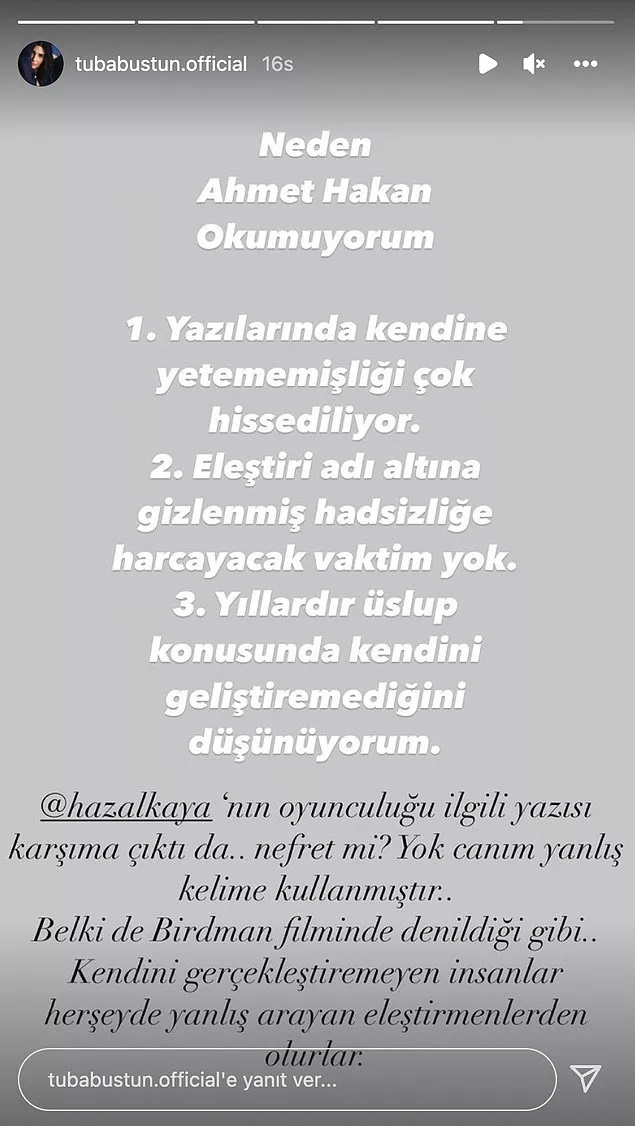 Ancak Ahmet Hakan geri adım atmadı. Gazeteci, sonraki yazısında Hazal Kaya ile ilgili eleştirilerine devam ederek şu ifadeleri kullandı; ‘’Hazal Kaya’nın oyunculuğundan nefret ettim abi. Ne yapayım? Elimde değil. Nefret ettim’’ ve ‘’Farkındayım, nefret çok güçlü bir duygudur. Ama Hazal Kaya’nın oyunculuğu o kadar kötü geldi ki bana, duygularımı ancak nefret kelimesi karşılayabildi. Ve dünkü yazıyı yazdım. Bu yazı nedeniyle bazıları bozulmuş bana.’’
