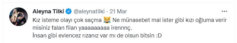 Ünlü şarkıcı Aleyna Tilki sosyal medya hesabından kız isteme geleneğini eleştirdi. Bu adeti saçma bulduğunu söyleyen Aleyna Tilki, paylaşımın sonuna 'irennnç' kelimesini de ekledi. Sosyal medyada da milyonlarca takipçisi olan Aleyna Tilki'nin paylaşımına bazı takipçileri tepki gösterirken bazı takipçileri de destek mesajları attı. Aleyna Tilki twitter hesabından yaptığı paylaşımda, "Kız isteme olayı çok saçma Ne münasebet mal ister gibi kızı oğluma verir misiniz falan filan yaaaaaaaaa irennnç. İnsan gibi evlencez rızanız var mı de olsun bitsin" ifadelerini kullanmıştı. Aleyna Tilki'nin paylaşımına bazı kullanıcılardan geleneklere saygılı olması yönünde tepkiler geldi. Ayrıca Aleyna Tilki'nin paylaşımlarında yaptığı kelime hatalarına da bazı kullanıcılardan tepki geldi. Aleyna Tilki'ye Türkçe'yi düzgün kullanması yönünde tavsiyeler de yapıldı.