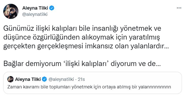 "Zaman kavramı bile toplumları yönetmek için ortaya atılmış bir yalannnnnnnnn. Günümüz ilişki kalıpları bile insanlığı yönetmek ve düşünce özgürlüğünden alıkoymak için yaratılmış gerçekten gerçekleşmesi imkansız olan yalanlardır… Bağlar demiyorum ‘ilişki kalıpları’ diyorum ve de… Bence günümüz ilişki kalıpları gerçekçi bağlar kurmamıza tamaaamen engel oluyor."