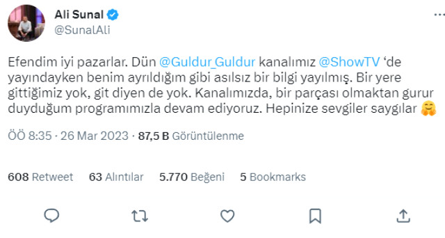 Konuyla ilgili olarak Ali Sunal Twitter hesabından şu şekilde bir paylaşım yaptı: "Efendim iyi pazarlar. Dün Güldür Güldür kanalımız Show TV‘de yayındayken benim ayrıldığım gibi asılsız bir bilgi yayılmış. Bir yere gittiğimiz yok, git diyen de yok. Kanalımızda, bir parçası olmaktan gurur duyduğum programımızla devam ediyoruz. Hepinize sevgiler saygılar" . Böylece Show TV ile aralarında problem olmadığını, Güldür Güldür ekibiyle beraber olduğunu bizzat kendi hesabından açıklamış oldu.