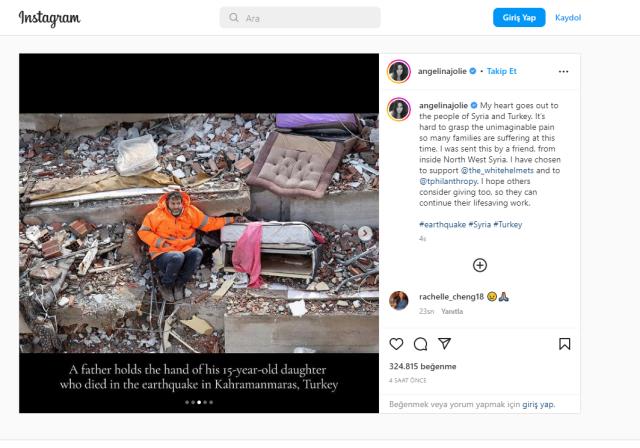 Türkiye ‘nin ve dünyanın dört bir tarafından deprem bölgesine yardımlar gönderiliyor ve taziye mesajları gönderiliyor. Türkiye’de depremin sembolü haline gelen Kahramanmaraşlı babanın enkazın altında ölen kızının elini tuttuğu resim ve drone görüntülerinden alınan Hatay fotoğrafları eşliğinde Türkiye ve Suriye’ye destek mesajı yayınlayan Jolie yardım kampanyası linkini de paylaşımına eklemeyi unutmadı..jpg)
