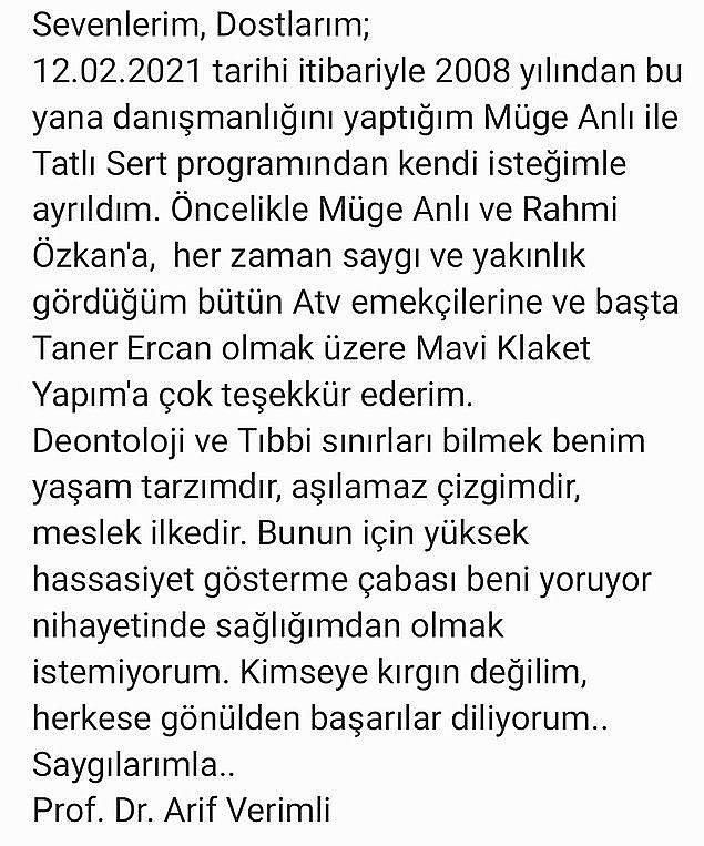 Ünlü programcı Müge Anlı ile Prof. Dr. Arif verimli sennelerce birlikte program yapmıştı. Ekranın en çok izlenen gündüz kuşağı programı olan Müge Anlı ile Tatlı Sert programında danışman olarak yer alan Arif Verimli, 2021 yılında programın kadrosundan ayrıldı. Arif Verimli 2008 yılında başlayan programdan 2021 yılında ayrıldı ve ayrıldığını bildirdiği paylaşımında kimseye kırgın olmadığını söyledi. Programın takipçilerini de şaşırtan bu ayrılığın perde arkasıyla ilgili Arif Verimli yeni açıklamalar yaptı. Yasemin Özçelik'in YouTube programına katılan Arif Verimli, Müge Anlı ve Şevki Sözen'le ilgili dikkat çeken açıklamalar yaptı.