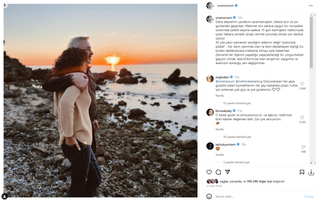 Mehmet Aslantuğ ise "Erkeksiniz; ya da kadın, elinizi tutan da kadın; ya da erkek, hiç fark etmez. Dönüp iyice bir daha bakın. Ya değer aşılar; ya da değer aşındırır! Hayatımıza kattığın her şey için minnettarım" diyerek Arzum Onan’a olan sevgi ve vefasını dile getirmişti..jpg)