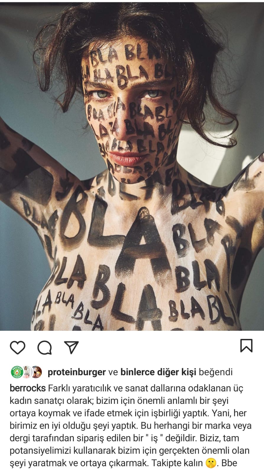 Fotoğraflarının altında "Farklı yaratıcılık ve sanat dallarına odaklanan üç kadın sanatçı olarak; bizim için önemli anlamlı bir şeyi ortaya koymak ve ifade etmek için işbirliği yaptık. Yani her birimiz en iyi olduğu şey yaptık. Bu herhangi bir marka veya dergi tarafından sipariş edilen bir "iş" değildir. Biziz, tam potansiyelimizi kullanarak bizim için gerçekten önemli olan şeyi yaratmak ve ortaya çıkarmak. Takipte kalın. Bbe"